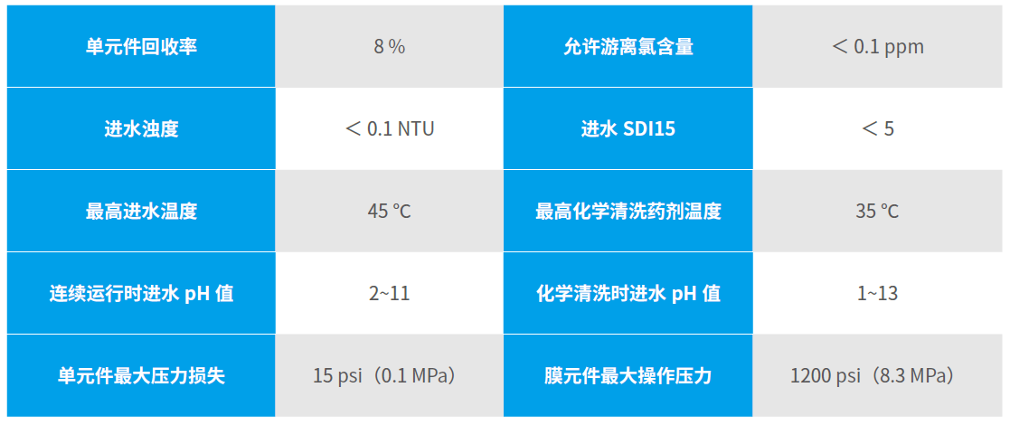 壽命長 獨特元件結構及后處理工序,配合34mil 進水寬流道,可在更寬泛的pH(1~13)內達到有效清洗效果,使元件更經久耐用;